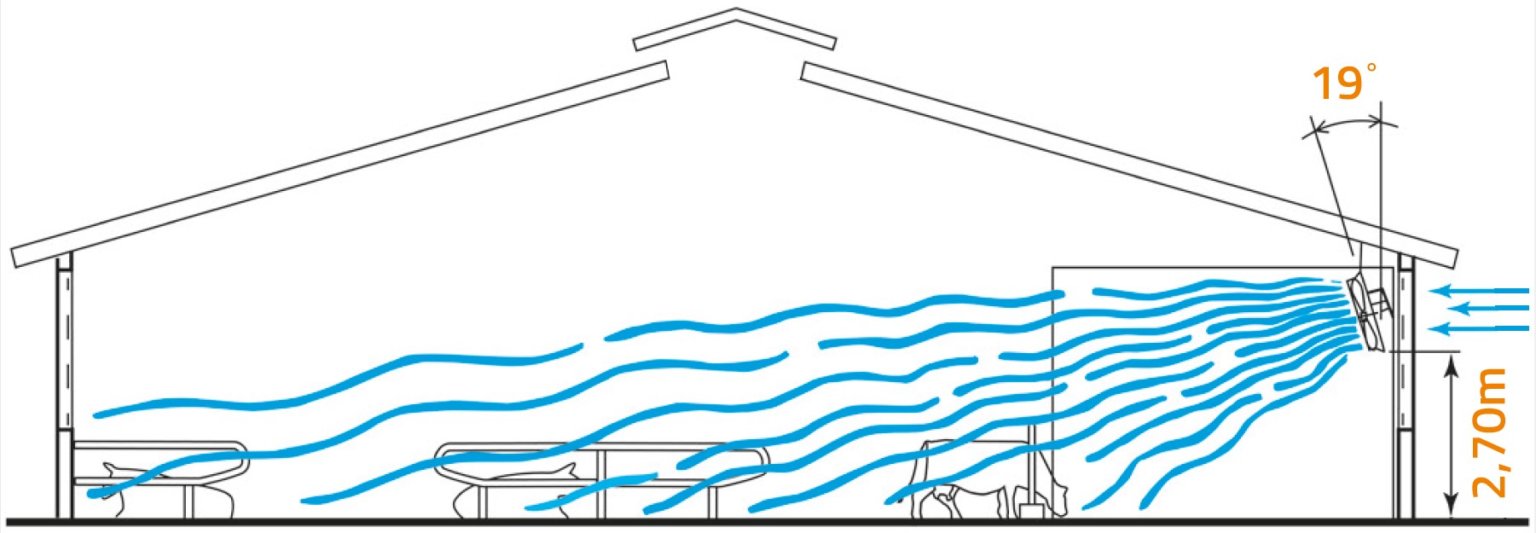 Auf diese Weise entsteht ein kühlender Luftstrom im Stall, durch den frische Luft über die Seitenwände eintritt und die erwärmte („verbrauchte“)